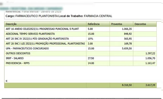 Outro ponto que levanta questionamentos envolve um profissional farmacêutico que, embora esteja vinculado a uma unidade básica de saúde, aparece recebendo remuneração como plantonista da UPA.
